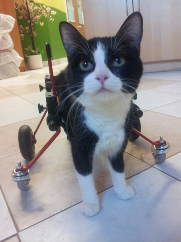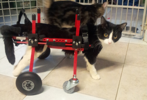 Today, the little black-and-white feline’s situation is much brighter. A customized mobility cart was donated to the cat, which allows Angel — whose inert rear body is hoisted onto the cart — to move more freely, propelling herself with her front legs.